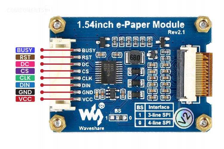 The pinout for the Waveshare 1.54" ePaper display module typically includes the following connections, which are essential for interfacing the display with a microcontroller. The Module uses an SPI bus for interfacing with the microcontroller.
