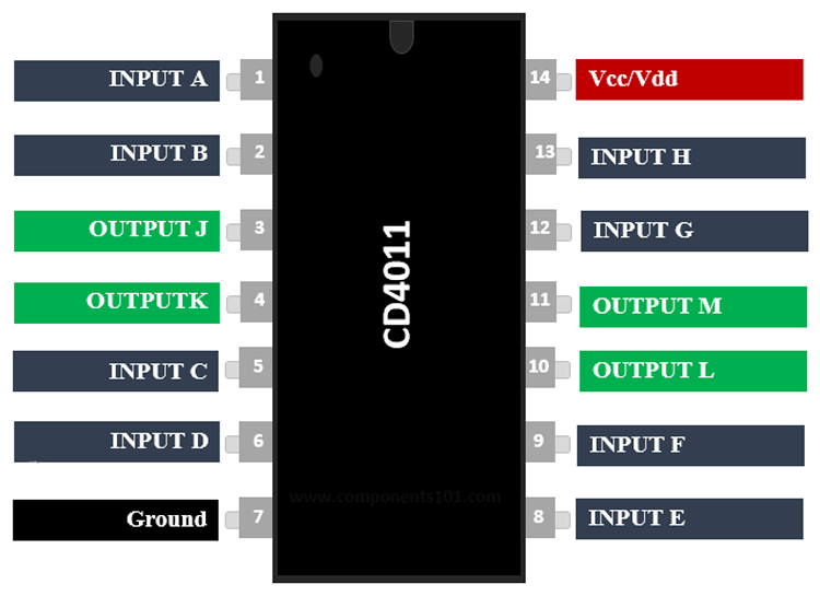 CD4011 has 12 input-output pins for four NAND gates. To use the CD4011 IC, just power it using the Vcc and ground pins. The typical operating voltage of the IC is +5V, but it can also be operated in +7V. The output voltage of the IC on the output pin will be equal to the operating voltage of the IC. As per the NAND gate truth table, when both the input of the Gate is Low the output will be high, otherwise, it will be low.