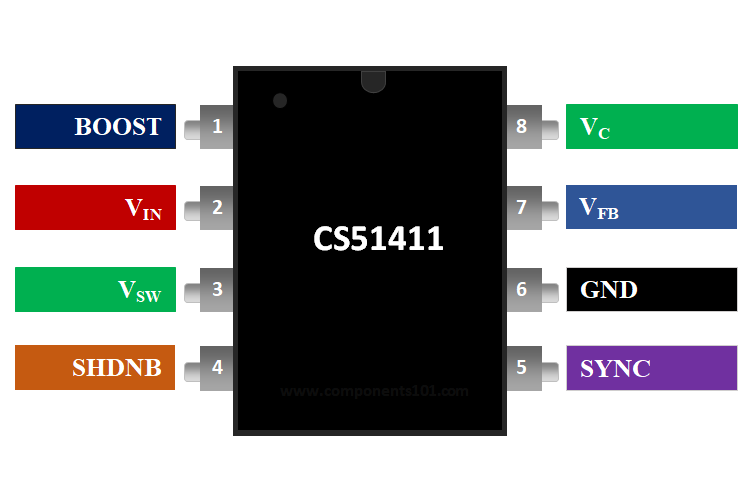 The CS51411 buck regulator provides leading-edge technology, a high level of integration and high operating frequencies allowing the layout of a switch-mode power supply in a very small board area. CS51411 uses the V2™ control architecture to provide an unmatched transient response, the best overall regulation and the simplest loop compensation for today’s high−speed logic. Protection circuitry includes thermal shutdown, cycle−by−cycle current limiting, and frequency fold back.