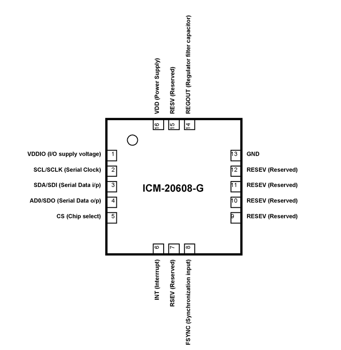 ICM-20608-G is a sixteen pin device as shown in diagram. The device is usually developed in to the modules and then used in applications for better convenience. These modules will have different pin out configuration depending on the module manufacturer. Although they all have different pin configurations they must have more or less same number of pins as the device and must perform same function. So just find appropriate pin name in the module and match it with the device pin name for avoiding the confusion.