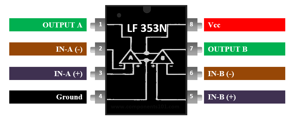 The LM353N is a Dual Package Input JFET Operational Amplifier. That is the input of these op-amp are connected through a high-voltage JFET making it suitable for low-noise, low-current and fast switching audio applications commonly used in Dual supply operation.