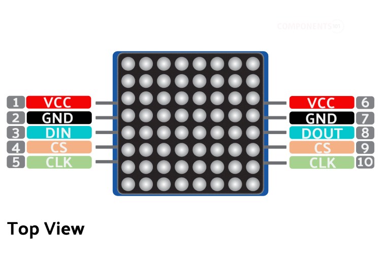 The MAX7219 LED matrix module has ten connections, five of which are for interfacing with the microcontroller and the other five are for daisy-chaining to the next module. Here is the PCB with the LED module removed for easy understanding followed by the pinout.
