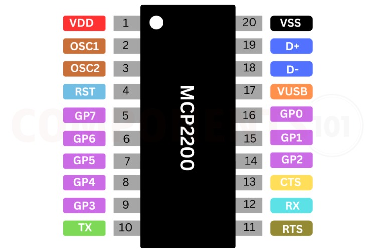 The MCP2200 is a USB -to-UART serial converter chip developed by Microchip Technology. We can use MCP2200 to convert a USB connection to a serial interface. It supports 12mb/s speed and can send and receive 64 bytes. Unlike other USB to UART converters, MCP2200 has 8 general purpose I/O pins. Four of the pins have alternate functions to indicate USB and communication status. Only a few components are needed for the proper working of this IC. The integrated termination resistors in the MCP2200 make it a more convenient and cost-effective solution for adding USB connectivity to your UART-based devices. The MCP2200 also has 256 bytes of integrated user EEPROM. This IC is available in 20-lead VQFN (5x5 mm), 20-lead SOIC and 20-lead SSOP packages.