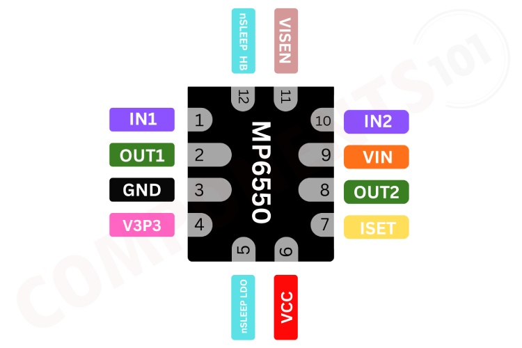 In this circuit VIN is the input voltage supply to the MP6550. The voltage can range from 1.8V to 22V, which is supplied to the VIN pin of the IC. CIN is a decoupling capacitor connected between VIN and GND to filter out any noise from the power supply.IN1 and IN2 are the control inputs from the external controller, which determine the direction and operation of the motor. nSLEEP_HB and nSLEEP_LDOare the sleep mode control pins, which can be used to put the H-Bridge or the LDO into sleep mode to save power.VISEN pin is used for current sensing. OUT1 and OUT2 are the output pins that connect to the DC motor. The motor will rotate based on the control signals received on IN1 and IN2. VCC This is the logic supply voltage for the IC. V3P3 pin outputs 3.3V, which is typically used to power other parts of the circuit or the controller. SET pin is used to set the current limit for the motor driver. A resistor is connected between ISET and GND to set this limit.