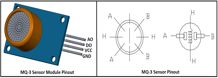There is a resistance across an A and B inside the sensor which varies on detection of alcohol. More the alcohol, the lower the resistance. The alcohol is measured by measuring this resistance. The sensor and load resistor form a voltage divider, and the lower the sensor resistance, the higher the voltage reading will be.