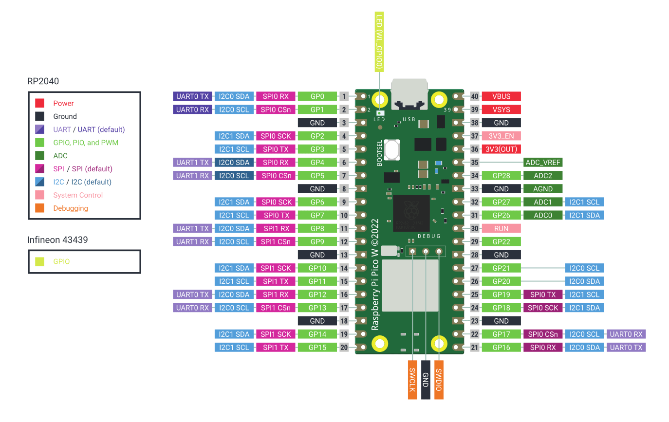 Raspberry Pi Pico W is pin-to-pin compatible with the older Pico board and has a total of 40 Pins out of which 26 are multipurpose GPIOs. These 26 digital input and output pins are labeled as GP0, GP1, and so on up to GP28. Out of these 30 pins, GP23, GP24, GP25, and GP29 are not exposed on the header, hence we only get a total of 26 GPIO pins. All GPIOs are operating at a 3.3V logic level. Apart from these pins, Pico w also offers a 3-Pin header for debug interface which is located near the RP2040 Chip.