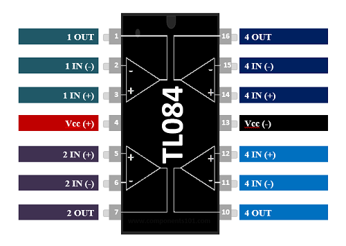 TL084 Op amp is very similar to the LM324 Op-Amp, they both have four Op-Amps inside them and have the exact same pinouts. The TL084 however is not meant for common 5V operation as it requires a minimum of 7V to operate. So Unlike LM324 or other op-amps, if you are using the Op-Amp in single supply mode, make sure you provide a minimum of 7V for the Op-Amp to function normally.
