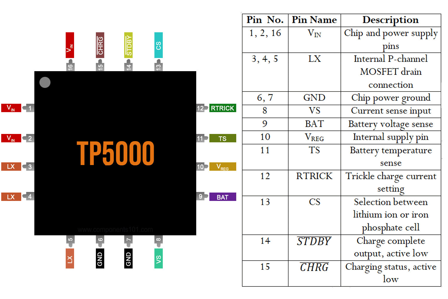 Note: Complete technical details can be found in the TP5000 datasheet linked at the end of this page.