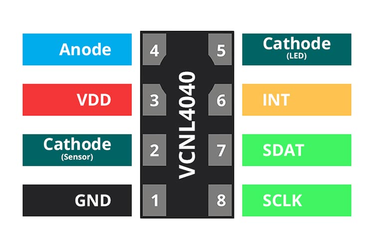 Decoupling capacitor is connected to the power supply pins for filtering. Pullup resistors are connected to the I2C lines. In case there are pullup resistors that are already there with MCU circuit you can ignore these. You could also use pullup or pulldown resistor with the interrupt pin depending on the type of interrupt programmed to the chip. Connect the anode pin to the power supply and connect the cathode pin together. There are 13 registers that can be read or configured though I2C. Each of these registers are 16bit wide.